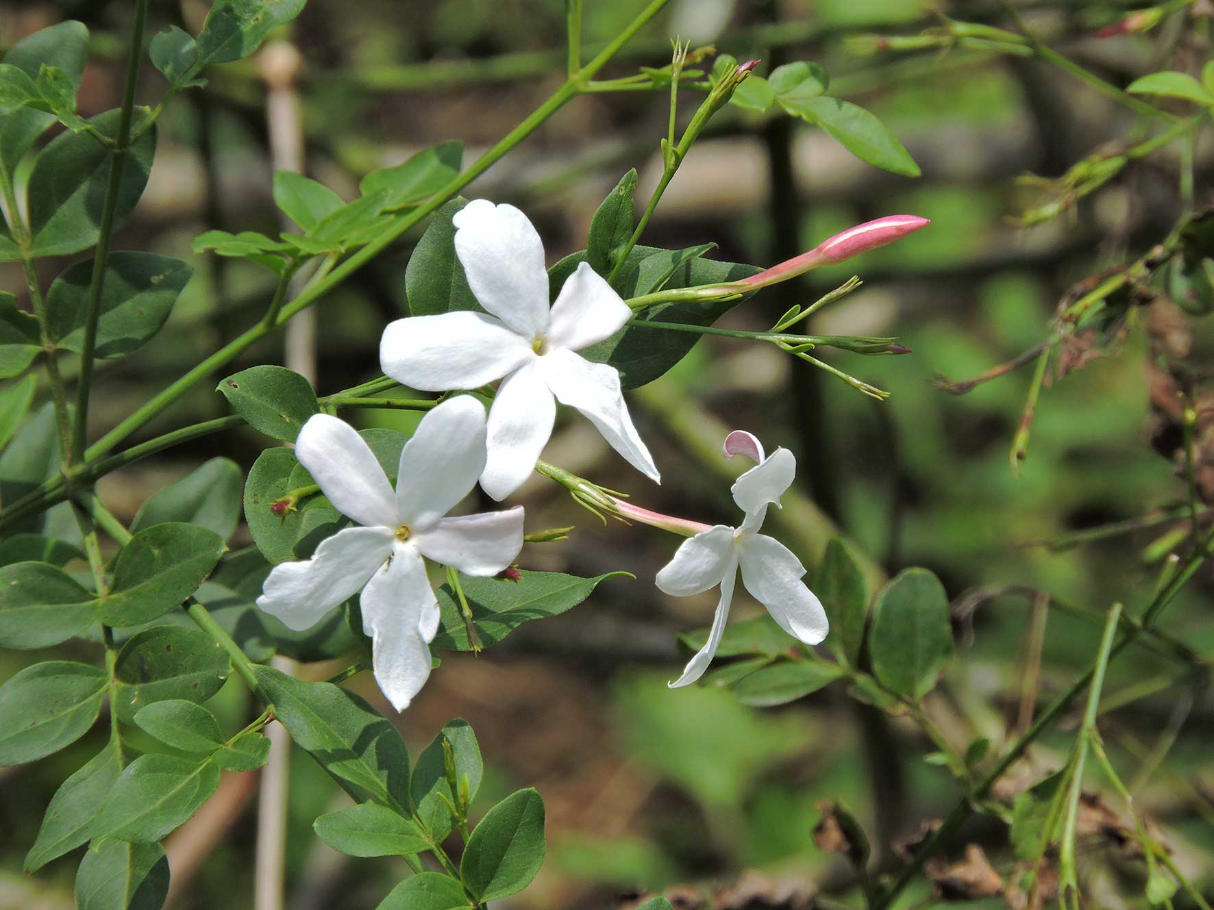 Terjemahan harafiahnya melati “sayap malaikat”. Tanaman ini asli India, Nepal, Bhutan, Bangladesh, Myanmar dan Thailand. The angel-wing jasmine bukan melati gambir dan tidak harum. Kadang di kios tanaman hias melati kosta, melati mentomori, Brunfelsia uniflora dengan dua warna putih dan ungu, juga disebut melati gambir. Yang tertipu menganggap the angel-wing jasmine sebagai melati gambir, bukan hanya konsumen tanaman hias melainkan juga para pedagangnya. Sebuah nurseri memposting di media sosial, bibit melati gambirnya sudah berbunga. Padahal itu angel-wing jasmine.