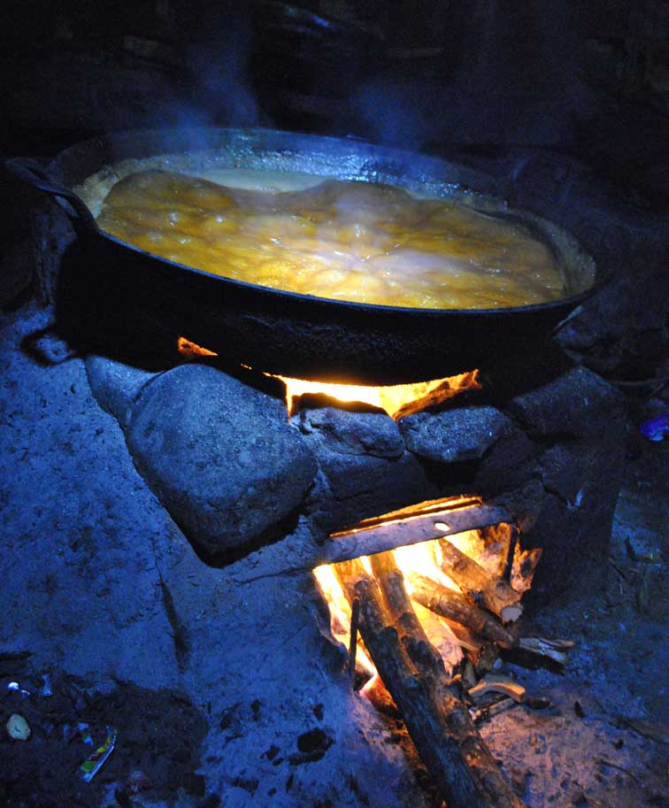 Setelah direbus atau dibakar sampai masak, buah yang terdiri dari tiga segmen itu dibuka dengan golok yang tajam, untuk diambil kolang-kalingnya. Pengambilan biji ini harus dilakukan ekstra hati-hati, sebab buah kolang-kaling mengandung asam oksalat (asam etanadioat, H2C2O4) yang akan menimbulkan gatal, dan iritasi pada kulit manusia. Mulut dan organ pencernaan musang aman dari asam oksalat kolang-kaling, karena asam liur dan asam lambung musang mampu menetralisir asam oksalat daging buah kolang-kaling. Biji kolang-kaling yang sudah terlepas dari buah, langsung dipipihkan, dengan cara memukulnya satu-per satu secara manual dengan pemukul dari kayu.