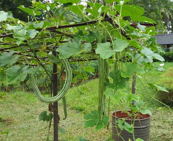 Di Taman Buah Mekarsari saya melihat ada buah lonjong warna abu-abu, bentuk seperti pepaya tapi tanamannya merambat. Kemudian ada lagi buah yang memanjang seperti ular, berwarna hijau dengan loreng putih persis seperti ular. Buah apakah ini? (Yuan, Cilegon).