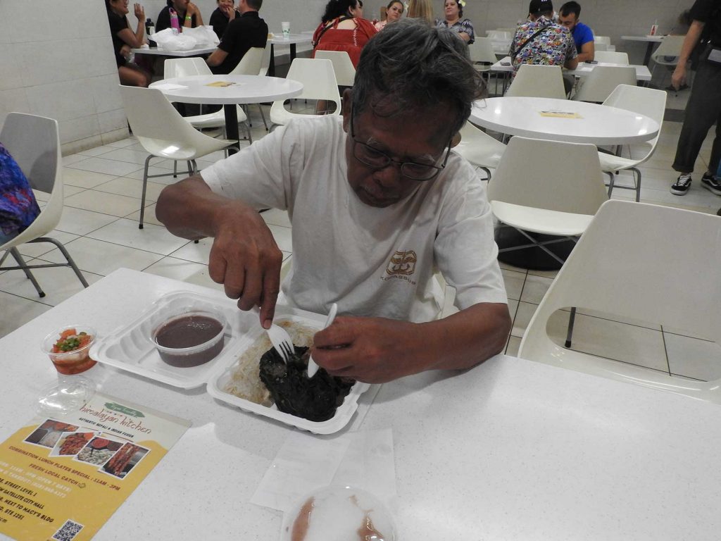 Salah satu gerai food court itu bernama Poi Bowl Ala Moana. Di gerai itu disajikan paket poi dengan lau-lau. Bisa dengan tambahan nasi atau mi putih yang terbuat dari beras. Saya memesan paket “Local Boy Plate” seharga 22 dolar AS (Rp350.000) per porsi. Harga rata-rata paket menu di Poi Bowl Ala Moana berkisar 20 – 30 dolar AS. Sebenarnya saya juga ingin mencicipi sup callaloo tetapi sudah habis. Saya lihat banyak pula pengunjung food court memesan paket poi dan lau-lau dengan berbagai kombinasinya. Ada yang disantap di tempat, tetapi kebanyakan dibungkus untuk dibawa pulang.
